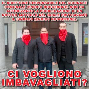 Trecate - Riceviamo e pubblichiamo una lettera aperta dei consiglieri Andrea Crivelli, Giorgio Capoccia e Federico Binatti, del Pdl, del gruppo d'opposizione in Consiglio comunale. "Il direttore responsabile del giornale comunale, Enrico Ruggerone, non ha autorizzato la pubblicazione di un nostro articolo sul numero di Aprile, in cui analizzavamo il pessimo risultato elettorale alle politiche del partito del sindaco Enrico Ruggerone. L’articolo, intitolato “Non era facile, ma Ruggerone è riuscito nell’impresa: fare peggio di Bersani!“, era peraltro già apparso in forma molto simile su altre testate locali. Non accettiamo che il sindaco utilizzi la sua veste di direttore responsabile del giornale comunale per impedire la pubblicazione di un articolo di analisi del voto delle recenti elezioni politiche. Ci vogliono forse imbavagliati? Abbiamo deciso di contestare la sua inspiegabile decisione in modo gogliardico scattando una foto all’ingresso del Municipio con un foulard rosso sulla bocca, ma intendiamo rassicurare immediatamente il signor sindaco che è solo una semplice protesta! I nostri comunicati stampa, la presenza nelle vie e nelle piazze di Trecate in contatto diretto con la cittadinanza, le associazioni e le categorie, gli atti presentati in aula (96 interrogazioni e 18 mozioni solo nel 2012) la nostra costante presenza nelle commissioni, alle conferenze dei capigruppo e in Consiglio comunale parlano chiaro: non condividiamo assolutamente la linea politico-amministrativa della sinistra trecatese che aumenta le tasse e diminuisce i servizi, che a quasi metà mandato ha dimostrato di non avere un progetto qualificante per la città, che improvvisa senza un’agenda politica e un chiaro metodo di lavoro e soprattutto non conosce minimamente le istanze della nostra comunità".