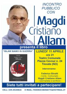 Trecate - Lunedì 11 aprile alle ore 21 presso il Teatro Comunale in Piazza Cavour n. 24 a Trecate si terrà la conferenza "Prima i trecatesi: immigrati, risorse o invasori?" dedicata alla presentazione del libro "Islam siamo in guerra" del giornalista e scrittore Magdi Cristiano Allam, atteso e gradito ospite della serata. "Sarà certamente una bella occasione - commenta Federico Binatti, consigliere provinciale e comunale nonché candidato sindaco per l'omonima lista civica in vista delle prossime amministrative - per confrontarsi e parlare di immigrazione, clandestini, profughi e integrazione, tutti temi molto seguiti dalla cittadinanza. Con un’ospite di elevata caratura come Magdi Cristiano Allam avremo la possibilità infatti di riflettere attentamente sul periodo storico che stiamo vivendo e alzare il livello del dibattito locale su argomenti di stretta attualità".