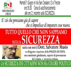 Trecate - Iniziativa del circolo di Trecate del Pd e in particolare di Marco Uboldi, già assessore ai Servizi sociali e all'Ambiente nelle Giunte Almasio e Ruggerone. "Vi invito ad una proposta che come circolo del Partito Democratico abbiamo organizzato. Si tratta di una cena di autofinanziamento che oltre a permetterci di stare insieme e condividere idee e riflessioni vedrà alle 21 un incontro dove parleremo di Sicurezza con il dott. Salvatore Musio, dirigente e ispettore della Polizia di Stato, esperto in prevenzione del crimine, per oltre 30 anni responsabile della Polizia Scientifica con interventi e collaborazioni in diversi comuni e realtà dove affrontare il problema della sicurezza dei cittadini non è solo uno slogan ma operatività sul campo e scelte ben mirate a tutela dei cittadini. Sarà una grande occasione per stare insieme, confrontarsi e conoscere dinamiche e punti di vista interessanti su due temi nei quali crediamo. Vi aspetto martedì 5 giugno alle 19.15 in via San Cassiano 13 a Trecate presso Il Circolo".
