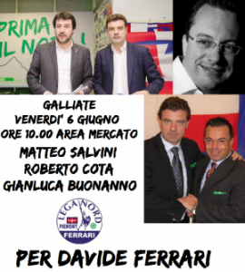 Galliate - E’ infatti prevista per le ore 10.00 di Venerdì 6 Giugno, presso l’area mercato di Piazza Vittorio Veneto, la visita del Segretario Federale, Matteo Salvini, che sarà in compagnia di Roberto Cota (Segretario Nazionale), Gianluca Buonanno (Neo-eletto Parlamentare Europeo), Luca Bona (Segretario Provinciale) e Corrado Frugeri (Segretario Cittadino). Tutto gli esponenti del Carroccio interverranno per portare il proprio entusiasmo e la propria voce a favore del candidato Sindaco Davide Ferrari, in vista del turno di ballottaggio che si terrà nella sola domenica 8 giugno con votazioni previste dalle ore 7 alle 23. Sarà altresì l’occasione per incontrare la cittadinanza e incrementare il già notevolissimo numero (più di mille nel solo week end scorso a Galliate) di firme a sostegno dei referendum proposti dalla Lega Nord.