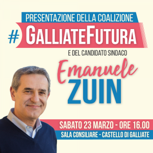 Galliate - GalliateFUTURA si presenta ai galliatesi sabato 23 marzo alle 16. Il candidato sindaco Emanuele Zuin e i rappresentanti delle liste della coalizione (Pd e altre liste civiche orientate a centrosinistra) incontreranno in sala consiliare nel Castello Sforzesco di Galliate le associazioni, i giornalisti delle testate locali e i cittadini che vorranno conoscere le idee proposte per l'amministrazione della città nei prossimi cinque anni. "È la prima uscita pubblica della nostra coalizione - dichiara Emanuele Zuin, il candidato sindaco - e sarà l'occasione per avviare un dialogo e un confronto costruttivo con i cittadini in previsione delle prossime elezioni comunali".