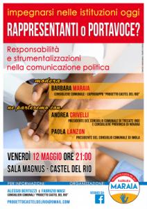 Trecate - Venerdì 12 maggio alle ore 21 presso la Sala Magnus a Castel del Rio si terrà l’evento: 'Impegnarsi nelle Istituzioni oggi: rappresentanti o portavoce? Responsabilità e strumentalizzazioni nella comunicazione politica'. Si tratta di un interessante momento di approfondimento su un tema di stringente attualità: oggi spesso i cittadini lamentano un crescente “distacco” non solo dalla politica in generale ma spesso anche dalle Amministrazioni locali. Ne nascono interrogativi non semplici: cosa fare, da cittadini, per partecipare maggiormente? Come deve comportarsi chi ha la responsabilità di amministrare la cosa pubblica, per invertire questa preoccupante tendenza? Che funzione svolge la comunicazione? Risultano più efficaci i canali tradizionali, spesso contestati nei contenuti, o sono più completi quelli legati al mondo di internet? A risolvere almeno in parte questi dubbi – pur senza la pretesa di essere esaustivi – ci aiuteranno due ospiti d’eccezione: Paola Lanzon, Presidente del Consiglio Comunale di Imola, e Andrea Crivelli, Presidente del Consiglio Comunale di Trecate e Consigliere della Provincia di Novara. L’evento non è rivolto solo ai giovani o agli “addetti ai lavori”, ma a tutti quei cittadini che con noi condividono la preoccupazione per questo crescente distacco dalla vita politico-amministrativa e vogliono investire un’ora del loro tempo per aiutarci a ridurlo.