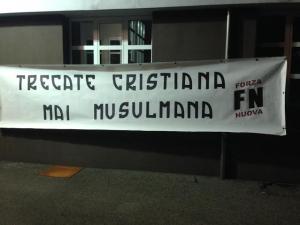 Trecate - "Nella notte i militanti forzanovisti novaresi - spiegano dal movimento di destra - hanno esposto in centro a Trecate uno striscione contenente la frase "Trecate Cristiana, mai Musulmana" in riferimento all'imminente apertura di un centro islamico che dovrebbe essere adibito come luogo di culto. Forza Nuova non vuole negare la libertà ed il diritto di ogni cittadino di professare la propria religione, ma chiede controlli sulle reali attività svolte nelle cosiddette case di preghiera, nelle quali possono essere svolti - come già accertato in Italia - indottrinamenti ed addestramenti terroristici nonchè detenzione di ogni tipo di materiale in quanto attualmente alle forze dell'ordine non è consentito l'accesso a qualsiasi luogo di culto islamico. Per evitare che si ripeta lo scenario di Parigi anche in italia, specialmente a seguito delle continue minacce dell'ISIS, Forza Nuova pretende un controllo minuzioso di tutte le moschee e centri culturali islamici presenti sul territorio per garantire l'adeguata sicurezza ai cittadini italiani".