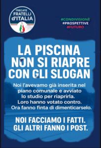 Trecate - Riceviamo e pubblichiamo dalla sezione locale di Fratelli d'Italia: "Per quanto riguarda la piscina comunale, visti i vari slogan delle sinistre trecatesi, intendiamo precisare che da sempre siamo attenti ai valori dello sport e alla manutenzione dei nostri impianti sportivi con importanti risorse destinate proprio a questi temi. Questi sono fatti oggettivi e non parole e lo stesso vale per la piscina comunale. Avevamo infatti inserito nel documento unico di programmazione la riqualificazione totale dell'impianto natatorio prevedendo interventi strutturali, fondamentali per la riapertura sia per la parte estiva sia per la parte invernale. Non solo parole: avevamo avviato lo studio per un progetto di finanza, così da riaprire la struttura nel modo più vantaggioso per l'Ente e dando un servizio di altissima qualità per le famiglie trecatesi. E sapete chi ha sempre votato contro facendo inutile e sterile ostruzionismo fomentando anche con visioni catastrofiche e non veritiere? Proprio quelli che oggi fanno gli slogan e chiedono ai cittadini se “è giusto che a Trecate la piscina sia chiusa?". Noi invece ci chiediamo se è giusto che quando c’era da lavorare e votare i progetti, si sono contraddistinti facendo opposizione strumentale senza considerare il bene della nostra Città. Ora che la piscina è chiusa e siamo prossimi alla competizione elettorale rispuntano con le promesse facili. È curioso, no? Noi siamo fatti in un altro modo: preferiamo i fatti agli slogan. La piscina comunale non è un sogno da propaganda del momento, è un impegno reale che noi ci avevamo assunto con responsabilità, mettendolo nero su bianco. I cittadini meritano la verità e non di essere presi in giro con queste chiacchiere menzognere. E la verità è semplice: noi abbiamo lavorato per riaprire la piscina. Loro hanno sempre votato contro. Sarà certamente nelle nostre priorità portare a termine quello che avevamo iniziato inserendo tra i primi punti del nostro programma amministrativo la riapertura della piscina comunale così come tutti gli altri impianti sportivi proprio come la nostra Trecate merita. Non permetteremo certamente alle sinistre trecatesi di fare loro un argomento che nei fatti hanno sempre ostacolato. La piscina non si riapre con gli slogan, ma con il lavoro vero!"