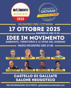 Galliate - Venerdì 17 ottobre il Castello di Galliate - Salone Neogotico ospita un convegno promosso dal Movimento 5 Stelle e dal Network Giovani – L’Officina del Futuro dedicato alle 'Idee in movimento - Ambiente, Territorio e le sfide del domani'. "L’iniziativa - spiegano i promotori - nasce come momento di confronto e partecipazione, con l’obiettivo di sensibilizzare la cittadinanza sui temi ambientali e territoriali e di raccontare esperienze concrete e risultati reali di una politica che agisce e produce cambiamento sul territorio. Durante la serata verranno illustrati progetti già avviati e nuove azioni in cantiere, in netta contrapposizione con la retorica immobile e da campagna elettorale delle destre. Un dibattito aperto e costruttivo, che pone al centro il valore della partecipazione civica e la responsabilità collettiva verso il futuro delle nostre comunità".