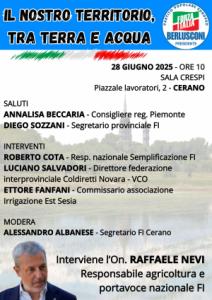 Cerano - Un importante convegno sull'agricoltura organizzato da Forza Italia si terrà presso la sala polivalente "Crespi" di Cerano il prossimo sabato 28 giugno dalle ore 10; dopo i saluti di Annalisa Beccaria, consigliere della Regione Piemonte, e di Diego Sozzani, segretario provinciale di FI, sono previsti i contributi dei qualificati ospiti. Interverranno: Roberto Cota - responsabile dipartimento semplificazione di FI, Luciano Salvadori - direttore interprovinciale Coldiretti Novara e VCO, ed Ettore Fanfani - commissario consorzio irrigazione Est Sesia. Concluderà l'on. Raffaele Nevi, responsabile dipartimento agricoltura e portavoce nazionale di Forza Italia. È un onore poter ospitare a Cerano un convegno di questo livello su un aspetto che caratterizza da sempre in modo importante il nostro territorio, quello dell'agricoltura con particolare riferimento alle risorse idriche; la partecipazione è aperta a tutti.