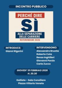 Galliate - Incontro pubblico sul tema 'Perché dire Si'. "L'obiettivo principale - spiegano i promotori - è quello di garantire ai cittadini un’informazione chiara e accessibile sui contenuti della proposta sottoposta a referendum, favorendo un dibattito pubblico basato su dati, analisi e confronto civile. Un contributo e una discussione trasparente e partecipata, mettendo al centro il merito della questione”. Appuntamento per giovedì 19 febbraio alle ore 20.30 al Castello nel Salone Neogotico, in piazza Vittorio Veneto a Galliate. L'incontro, promosso da Forza Italia Galliate e dal Comitato per il Sì, è introdotto da Gianni Rigorini e vede l'intervento di: Alessandro Brustia, Roberto Cota, Renzo Inghilleri, Giovanni Porzio e Carla Zucco.