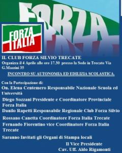 Trecate - Il Club Forza Silvio Trecate celebra il primo mese di vita (l'inaugurazione ha avuto luogo nientemeno che con la telefonata in diretta dell'ex premier Silvio Berlusconi nel corso di un incontro al Teatro Comunale) con un convegno di stretta attualità, sul tema "Autonomia ed edilizia scolastica". L'appuntamento è per venerdì 4 aprile alle 17.30 presso la sede in via Mazzini 35 (vicino alla centrale piazza Cavour). Parteciperanno l'on. Elena Centemero - responsabile nazionale per Scuola ed Università, Diego Sozzani - presidente della Provincia e coordinatore provinciale di Forza Italia, Danilo Rapetti - responsabile regionale Club Forza Silvio, Rossano Canetta - coordinatore Forza Italia Trecate e Fernando Fiorentino - vice coordinatore Forza Italia Trecate.