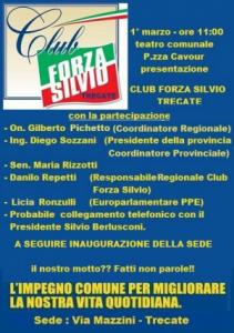 Trecate - Tutto pronto per l'inaugurazione del nuovo Club Forza Silvio che aprirà i battenti sabato 1° marzo con un incontro pubblico organizzato al Teatro comunale in piazza Cavour. Appuntamento per le 11 con numerosi ospiti politici: l'on. Gilberto Pichetto (coordinatore regionale), l'ing. Diego Sozzani (presidente della Provincia e coordinatore provinciale), quindi la sen. Maria Rizzotti, Danilo Repetti (responsabile regionale dei Club Forza Silvio) e l'europarlamentare Licia Ronzulli. Probabile anche una sorpresa per il pubblico 'forzista' in sala: un collegamento telefonico direttamente col presidente Silvio Berlusconi. A seguire ci sarà l'inaugurazione della nuova sede in via Mazzini (a poca distanza da piazza Cavour). "Il nostro motto? - dicono dal Club Forza Silvio - Fatti, non parole! L'impegno comune per migliorare la nostra vita quotidiana". Referente locale del Club sarà il consigliere comunale ed ex assessore Rossano Canetta; nel gruppo non mancano i giovani cui arriva anche il sostegno e l'appoggio dai 'colleghi' di Novara e di tutta la provincia.