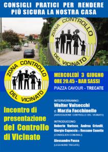Trecate - Cerano - Incontro pubblico di presentazione del progetto “Controllo di Vicinato”, promosso da Roberto Varisco, Andrea Crivelli, Giorgio Capoccia, Rossano Canetta (Consiglieri Comunali di Trecate) e Alessandro Pasca (Lega Nord). L'incontro si svolgerà presso il Bar Sassi Mercoledì 3 giugno alle ore 20.45; interverranno Walter Valsecchi e Marzia Facchinello dell'Associazione "Controllo del Vicinato".