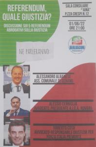Cerano - Il coordinamento ceranese di Forza Italia ha organizzato un incontro pubblico per discutere ed informare i cittadini circa i cinque quesiti referendari in tema di giustizia su cui gli elettori saranno chiamati ad esprimersi nella votazione indetta per il prossimo 12 giugno. "Mercoledì 1 giugno alle ore 21 - spiegano Alessandro Albanese (assessore comunale e responsabile FI Cerano) e Chiara Moletti (consigliere comunale, responsabile FI giovani Cerano) - presso la Sala Consiliare "M. Aina" del Municipio di Cerano ne parleranno l'avv. Alessio Cerniglia, presidente novarese dell'Associazione Nazionale Giovani Avvocati, e l'avv. Roberto Cota, ex-Governatore della Regione e responsabile giustizia del partito azzurro in Piemonte. Sarà un'occasione per approfondire l'argomento del Referendum e parlare delle questioni inerenti la giustizia, importanti perché possono riguardare la vita di tutti. La cittadinanza è invitata a partecipare".