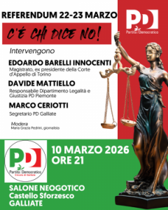 Galliate - Il Circolo del Partito Democratico di Galliate si mobilita a sostegno della campagna “Vota No per difendere la Costituzione” in vista del referendum del 22 e 23 marzo per la riforma della Magistratura, promosso dalla maggioranza di Governo. Martedì 10 marzo alle ore 21, nel Salone Neogotico, si terrà l’assemblea pubblica “Riforma Giustizia. Le ragioni del NO”.