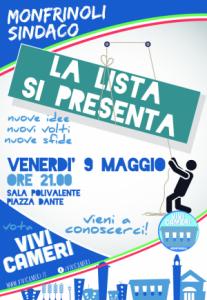Cameri - Il 9 maggio, alle 21, si terrà in sala polivalente in piazza Dante a Cameri la serata di presentazione della lista civica Vivi Cameri che appoggia la candidatura a sindaco di Rosa Maria Monfrinoli. Questi i nomi della lista: Baiesi Valerio, Bellinzoni Piero Antonio, Bordini Luca, Carollo Giorgio, Carrer Paolo, Colombo Azzurra, Daverio Marcella, Devecchi Stefania, Filippi Alberto, Gambaro Simone, Gennaro Paolo, Lena Gemma, Miccoli Paola, Micheletto Andrea, Parmigiani Matteo e Vullo Michele.