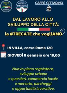 Trecate - Il Caffè Cittadino prosegue come spazio di ascolto e partecipazione: "Proposte e suggerimenti, idee e contenuti verranno condivisi insieme ai cittadini - spiega Rosa Criscuolo, già assessore all'Urbanistica e Commercio nell'ultima Giunta Binatti prima del comissariamento - con il suo format ormai consueto, che vedrà al termine un momento conviviale. Giovedì 8 gennaio alle ore 18 presso il Ristorante in Villa a Trecate si terrà il terzo Caffè Cittadino del progetto #Trecate che vogliAmo, un nuovo momento di confronto aperto, dedicato ai temi del lavoro, commercio e sviluppo urbano con un’attenzione particolare al nuovo Piano Regolatore, alla vita dei quartieri, al centro storico e al mercato cittadino, per sviluppare la visione e le potenzialità della nostra Trecate. È un’occasione per confrontarsi in modo diretto e contribuire attivamente alle scelte che riguardano il presente e il futuro della nostra città. Tutti sono invitati a partecipare. È il momento di scrivere insieme la #Trecate che vogliAmo".