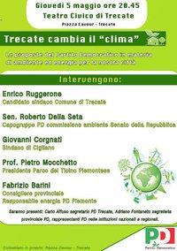 Trecate - Il Teatro Comunale ospita giovedì 5 maggio alle 21 un convegno dedicato al tema "Trecate cambia clima". Saranno esposte dai relatori le proposte del Partito Democratico in materia di ambiente ed energia per il governo della città. Intervengono Enrico Ruggerone (candidato sindaco per il centrosinistra), il sen. Roberto della Seta, il consigliere Fabrizio Barini, il sindaco di Cigliano Giovanni Corgnati e Pietr Mocchetto, capolista del Pd e presidente uscente dell'Ente Parco del Ticino.