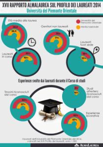 Novara - È stato presentato oggi, giovedì 28 maggio, all’Università di Milano Bicocca, nel corso del convegno “I laureati tra (im)mobilità sociale e mobilità territoriale”, il XVII Profilo dei laureati italiani redatto dal Consorzio Interuniversitario AlmaLaurea. I laureati dell’Università del Piemonte Orientale del 2014 coinvolti nell’indagine sono stati 1.582; si tratta di 1.053 laureati di primo livello, 276 laureati nei percorsi magistrali biennali e 242 laureati a ciclo unico (i restanti sono laureati pre-riforma). L’età media alla laurea, oggi pari a 26,5 anni per il complesso dei laureati (la media italiana è di 26,4), varia tra 25,7 anni per i laureati di primo livello e 26,5 anni per i magistrali a ciclo unico e 29 per i magistrali biennali. Su tale risultato incide sicuramente il ritardo nell’iscrizione al percorso universitario, oggi più marcato rispetto a quanto non avvenisse prima dell’avvento della Riforma Universitaria. La durata media degli studiè pari a 4,4 anni (4,6 la media nazionale): più nel dettaglio, è 4,2 anni per i laureati di primo livello, 6,4 anni per i magistrali a ciclo unico e 2,8 per i magistrali biennali. Su cento laureati, 55 (contro 54) terminano l’università in corso: in particolare, sono 54 laureati triennali, 53 laureati a ciclo unico e 64 magistrali. Il voto medio di laurea è pari a 99,6, più basso della media nazionale che si assesta su un 102,2; in particolare, è 97,2 per i laureati di primo livello, 102,4 per i magistrali a ciclo unico e 106,9 per i magistrali biennali.