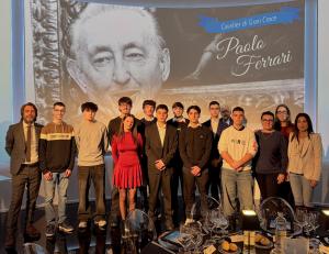 A premiare gli studenti Paolo Ferrari con Anastasia e Margherita Ferrari, nipoti del fondatore. Presenti all’appuntamento Francesca Malarby, Dirigente Scolastico dell’Isitituto e una rappresentanza di professori con Francesco Ticozzi, Presidente della Fondazione ITI Omar e Maurizio Bonaccio, Presidente Omaristi.