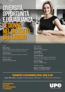 Novara - Il 2 dicembre, presso il Complesso Universitario "Perrone" (9.30-12.00, aula 104-105, Via Perrone 18, Novara), all’interno del corso seminariale di Giurisprudenza tenuto dalla dott.ssa Carmen Aina e dalla prof.ssa Bianca Gardella Tedeschi, si terrà il convegno “Diversità, opportunità e uguaglianza: le donne nel mercato del lavoro” che tratterà il tema della possibilità da parte delle donne di rompere quel soffitto di cristallo che spesso impedisce loro di raggiungere carriere di alto profilo.