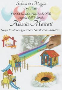 Novara - Sabato 10 maggio alle ore 10 ci sarà la Festa dell'inaugurazione della scuola dell'infanzia "Alessia Mairati" Largo Cantore - Quartiere San Rocco Novara. Presenti tutte le autorità cittadine. L'associazione ha deciso di "adottare" la struttura, e ha già provveduto ad abbellire gli interni dell'edificio pitturandolo, con nuovi arredi e molto altro. All'esterno nuovi giochi della linea Casa Alessia della TFL di Arezzo, azienda nazionale leader del settore. Nel pomeriggio, verso le ore 15, la festa continua presso il Parco dei Bambini di Novara, a cura sempre dell'associazione ci sarà un trucca bimbi, baby dance, tanta animazione, zucchero filato e molto altro. Grandi e piccini Vi aspettiamo numerosi, se avete una maglietta gialla tanto meglio.
