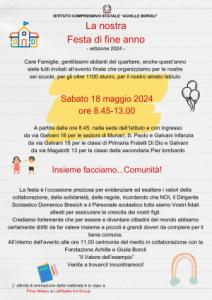Novara - Conto alla rovescia per la tradizionale Festa di fine anno dell'Istituto Comprensivo “Achille Boroli” di Novara. L'appuntamento è per la mattinata di sabato 24 maggio (ore 9,30-13) nella sede di Via Magalotti 13. Le alunne e gli alunni delle scuole d'Infanzia Munari, San Paolo e Galvani, le classi delle scuole primarie Fratelli Di Dio e Galvani, le studentesse e gli studenti della scuola secondaria Pier Lombardo insieme al Dirigente Scolastico Dottor Domenico Bresich, ai docenti ed al personale scolastico accoglieranno genitori, parenti, amici ed abitanti del quartiere facendo mostra e condividendo - in un unico luogo - i frutti di un anno di lavoro.