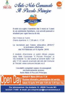 Trecate - Si aprono martedì 16 febbraio le iscrizioni al Nido comunale “Il Piccolo Principe” per l’anno educativo 2016-17. Il nido accoglie i bambini dai 3 mesi ai 3 anni, con orario di apertura 7.30 – 17.30. La modulistica, l’Informativa e il Regolamento possono essere ritirati presso l’Asilo Nido in Via Andante n. 12, oppure richiesti presso l’Ufficio l’U.R.P. del Comune e scaricabili, a breve, dal sito del Comunewww.comune.trecate.no.it. La domanda compilata dovrà essere consegnata esclusivamente presso l’Asilo Nido dal lunedì al venerdì dalle 9 alle 17. Per ulteriori informazioni è possibile contattare la Coordinatrice dell’Asilo Nido al numero 0321 71469.