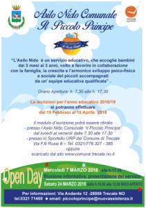 Trecate - Si informa che a partire dal 15 febbraio, sino al 16 aprile 2018, sono aperte le iscrizioni per l’Asilo Nido Comunale “Il Piccolo Principe”, relative all’anno educativo 2018/19. La domanda di ammissione e l’Informativa completa, saranno disponibili dal 12 febbraio sul sito internet del comune: www.comune.trecate.no.it, oppure presso l’Asilo Nido Comunale “Il Piccolo Principe” e l’Ufficio Relazioni con il Pubblico. L’Asilo è aperto dal lunedì al venerdì, dalle 07.30 alle 17.30, con possibilità di usufruire di servizi aggiuntivi e di orario prolungato. Per maggiori informazioni è possibile contattare il nido al seguente numero: 0321 71469, e-mail: piccoloprincipe@nuovassistenza.it.