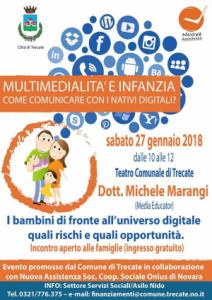 Trecate - 'Multimedialità e infanzia - Come comunicare con i nativi digitali?', se ne parla a Trecate grazie all'intervento del dott. Michele Marangi sabato 27 gennaio dalle 10 alle 12 presso il Teatro Comunale di Trecate; si tratta di un incontro aperto soprattutto alle famiglie e agli operatori educativi che si avvale della collaborazione della cooperativa Nuova Assistenza di Novara. L'ingresso gratuito. L’evento è promosso dal Comune di Trecate - assessorato all'Istruzione; info: 0321 776375.
