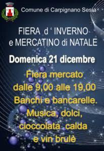 Carpignano Sesia - Domenica 21 dicembre dalle ore 9.00 alle ore 19.00 presso il centro del paese, ovvero piazza Libertà - via Cavour - via Dante e piazza Marconi -, si terrà la manifestazione "Fiera d'inverno e mercatini di Natale" patrocinata dal Comune di Carpignano, a cui parteciperanno diversi negozianti del paese, che apriranno i loro negozi con degustazioni e idee regalo, alcune associazioni del paese, che prepareranno specialità culinarie e bevande, e alcuni banchi di venditori dei paesi limitrofi, il tutto allietato, nel pomeriggio, dalla musica del gruppo "SoloZero".