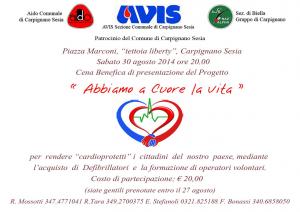 Carpignano Sesia - Sabato 30 agosto presso la Tettoia di Carpignano Sesia si terrà una Cena Benefica dal titolo "Abbiamo a cuore la vita", organizzata dai gruppi AVIS e AIDO di Carpignano Sesia e dall'Ass. Alpini di Carpignano Sesia, allo scopo di raccogliere fondi per l'acquisto di defibrillatori a disposizione del Comune, da installare in punti strategici del paese, e per la formazione di personale volontario. Allego il volantino dell'iniziativa e mi rendo disponibile, su richiesta, a fornire informazioni e materiale fotografico circa l'esito dell'iniziativa.