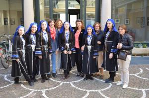 Borgomanero - La Georgia sbarca a Borgomanero. O meglio, i ragazzi di Tiblisi “restituiscono” la visita che i coetanei della Scuola Secondaria di Primo Grado “P. Gobetti” di Borgomanero hanno effettuato nei primi giorni di Novembre dello scorso anno. Il tutto nell’ambito dello scambio culturale Italia-Georgia. I ragazzi georgiani rimarranno in Città sino al prossimo mercoledì 15 aprile, ospiti di famiglie borgomaneresi. In questo periodo frequenteranno la scuola con i “colleghi” italiani, seguiti dalle professoresse Marina Tappa e Valentina Zanetta. Nella giornata di mercoledì 8 aprile, inaugurando la mostra fotografica inerente allo scambio culturale (rimarrà aperta sino al 10 aprile), hanno proposto alla cittadinanza le specialità dolciarie del loro paese improvvisando anche una danza tipica nel cortile di Palazzo Tornielli.