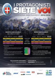 Novara - Sotto lo slogan “I Protagonisti siete Voi” prende il via la nuova Campagna abbonamenti per la stagione 2013/2014 degli Azzurri, che inizierà ufficialmente il 1° luglio e proseguirà fino alla settimana antecedente la prima gara casalinga di campionato. Sarà possibile sottoscrivere il proprio abbonamento direttamente ed esclusivamente nelle 123 filiali della Banca Popolare di Novara sparse sul territorio. Prelazione: dal 1 al 17 luglio 2013 per i vecchi abbonati che vogliono rinnovare l’abbonamento alla stagione 2012/2013. Si precisa che il diritto di prelazione, garantirà l’acquisto dell’abbonamento nel medesimo settore e posto o in un diverso settore tra i posti disponibili (ossia non impegnati da altra prelazione). Per il rinnovo il vecchio abbonato dovrà presentarsi (nei giorni e negli orari di apertura degli sportelli bancari) munito di Tessera del Tifoso (ed eventualmente anche del vecchio abbonamento, segnaposto), documento di identità in corso di validità e modulo denominato “Condizioni Generali di sottoscrizione” debitamente compilato e firmato dal richiedente (modulo scaricabile su www.novaracalcio.com o ritirabile presso gli sportelli bancari).