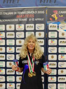 Novara - Ai Campionati Italiani Master, disputati a Salsomaggiore da mercoledi 8 a domenica 12 aprile per la Regaldi sono arrivate due medaglie d’oro una d’argento ed una di bronzo grazie ad Elisabetta Loaldi e Claudio Sassi. Elisabetta (foto) ha confermato, nonostante una concorrenza agguerrita, il titolo di campionessa d’Italia in doppio femminile, giocato con Rosaria Mauriello del TT Stella del sud di Napoli e quello di doppio misto con Adeyemo Fatai del TT Circolo Prato 2010. In entrambe le gare Elisabetta ed i suoi compagni di doppio hanno espresso un ottimo tennistavolo non lasciando nemmeno un set agli avversari! Salgono così a 23 i titoli italiani per Elisabetta Loaldi!