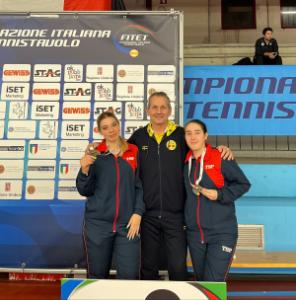 Novara - Pioggia di medaglie grazie ad Erika Stanglini e Chiara Zanetta ai Campionati Italiani Under 19 disputati a Terni da venerdì 24 a domenica 26 febbraio. Le nostre portacolori, guidate in panchina dal tecnico Stefan Stefanov, sono riuscite nell’impresa di ottenere un argento e due bronzi nelle gare di doppio e nel torneo per squadre di società! Il titolo di vice campioni d’Italia è arrivata nella gara di doppio misto, giocata dalla nostra Erika in coppia con Vallino Costassa Federico del TT Torino: dopo aver raggiunto la finale con autorità Erika e Federico si sono dovuti arrendere alla coppia formata da Nicole Arlia (numero 3 delle classifiche assolute ) e Bassi Leonardo entrambi del TT Castel Goffredo. Nona posizione per Chiara in coppia con Gamba Francesco del TT Biella. Enorme soddisfazione per il terzo gradino del podio ottenuto nella gara a squadre da Chiara ed Erika al cospetto di team con possibilità economiche nettamente superiori alle nostre, a conferma che l’amicizia e il lavoro svolto in società possono sopperire alle croniche mancanze di fondi! Per la cronaca la gara è stata vinta dal TT Muravera, secondo il Castel Goffredo, terzi pari merito Regaldi e TT Torino. Costruito in casa anche il bronzo conquistato da Erika e Chiara nel torneo di doppio femminile! Anche qui abbiamo avuto la sfortuna d’incrociare in semifinale la fortissima Nicole Arlia in coppia con Thai Kim lan Elena. Bene anche nel torneo di singolo U 19 con la quinta posizione di Erika. Purtroppo Chiara si è dovuta arrendere ad un persistente problema fisico e non ha ottenuto il pass per il tabellone finale. Due atlete, quattro gare e cinque medaglie!