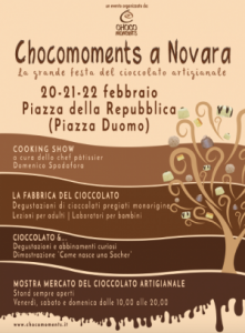 Novara - La città di Novara si prepara ad accogliere la squadra dei maestri cioccolatieri di ChocoMoments e le loro raffinate e dolci creazioni al cioccolato. C’è grande attesa, infatti, per la Festa del Cioccolato Artigianale organizzata da ChocoMoments in programma da venerdì 20 a domenica 22 febbraio in Piazza della Repubblica (Piazza Duomo). Un weekend all’insegna del gusto e della dolcezza dedicato agli appassionati di cioccolato di tutte le età che potranno partecipare alle tante iniziative in programma presso la grande struttura che mostra in presa diretta, tutte le fasi di lavorazione del cioccolato. Un laboratorio a cielo aperto che ospita cooking show, lezioni per adulti e laboratori per i bambini. Cioccolatini e praline, creme e liquori al cioccolato e divertenti sculture di che sembrano animarsi: topolini, coccinelle, scarpette, utensili per la casa, telefonini, tutti interamente realizzati con vero cioccolato artigianale, saranno in vendita negli stand aperti dalle 10 alle 20. Ma “ChocoMoments a Novara” non è solo una mostra-mercato del cioccolato, è anche un modo originale per promuovere la cultura del cioccolato buono e che fa bene, lavorato seguendo protocolli rigidi e con prodotti di altissima qualità.Sono tanti, infatti, gli eventi culturali che si svolgeranno presso la struttura che accoglierà il pubblico con la sua imponente macchina per fare il cioccolato sempre in azione. Tanti anche gli eventi e le dugustazioni in collaborazione con le attività commerciali della città.