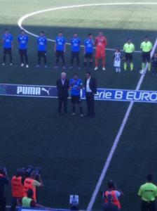 Novara - Con un gol alla... Comi (inteso come il padre Antonio, già attaccante del Torino metà anni '80) il Novara supera all'ultimo secondo, anzi a tempo scaduto (era il 95') un Siena ordinato e molto 'operaio', messo in campo dal mister Beretta con l'intento di portare a casa un pareggio. La sconfitta di Avellino ha però dato la scossa agli azzurri di mister Aglietti, che hanno meritato i 3 punti, anche se il successo è arrivato proprio al fotofinish. Davanti a quasi 4.500 spettatori il Novara inizia in sordina e sembra aver paura di prendere le redini del gioco; dall'altra parte i bianconeri non affondano e dimostrano di avere chiari limiti senza l'estro e la fantasia di Rosina. Da segnalare che prima del fischio d'inizio Gonzalez ha letto il giuramento di fedeltà ai valori dello sport e della correttezza (nella foto). Al 4' per poco Faragò non devia in rete un bel cross dal fondo di Lazzari. Kosicky poco dopo compie un intervento da cardiopalma sulla punizione di D'Agostino. Al 28' la punizione di Buzzegoli viene smanacciata in corner da Lamanna. Sul finire il Novara divora 2 occasioni colossali dal gol: prima per un quasi autogol incredibile, dopo un'azione insistita di capitan Gonzalez; infine con Pesce che a tu per tu con Lamanna si fa ipnotizzare dall'estremo difensore del Siena e calcia sul portiere.