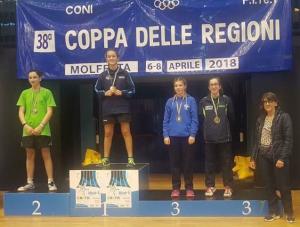 Novara - Erika Stangalini, giovane atleta della Regaldi Novara, ha partecipato in rappresentanza della selezione piemontese alla "38a Coppa delle Regioni" importante gara individuale e a squadre under 14 disputata a Molfetta dal 6 al 8 aprile. La rappresentativa piemontese ha confermato gli ottimi risultati ottenuti nella storia di questa competizione salendo sul terzo gradino del podio dietro l'Emilia Romagna e la Sicilia. Molto bene Erika nella gara di singolo femminile dove ha conquistato la medaglia di bronzo grazie ad un ottima prova!