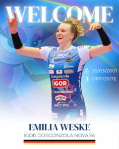 Emilia Weske (opposto Igor Gorgonzola Novara): “Non vedo l’ora di iniziare questo nuovo capitolo della mia carriera, con un club prestigioso e una squadra forte e ambiziosa. Mi aspetto una stagione bella ed emozionante, sono felice di ritrovare Lina Alsmeier che conosco fin dalle nazionali giovanili e che ho già sfidato da avversaria. Ora sarà bello condividere questa esperienza, così come non vedo l’ora di fare del Pala Igor la mia nuova casa. La scorsa stagione ho potuto vivere da avversaria una partita speciale, a Santo Stefano, in un palasport gremito e caloroso e sarò davvero felice di poter rivivere questo genere di atmosfera da “padrona di casa” nel corso di questa stagione”.