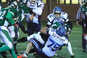 Più macchinosa invece la manovra offensiva, che ha alternato buoni guadagni di campo a momenti di blocco totale. A passare in vantaggio, solo al secondo quarto, sono i padroni di casa, con una ben eseguita QB Sneaksuccessivamente trasformata, per un vantaggio parziale di 7 punti, quasi raggiunti prima dello scadere dell’half-time da una pari segnatura del QB novarese Nicolo Zanforlin #2, sfumando però il pareggio;risultato parziale di 7 a 6 per i padroni di casa a metà partita.