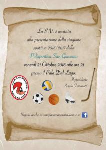 Intanto è tutto pronto per la presentazione della stagione 2016/17 della Polisportiva San Giacomo. Appuntamento al Pala Dal Lago di viale Kennedy venerdì 21 ottobre a partire dalle ore 21. Un invito che parte dal presidente Sergio Ferrarotti e al quale non si può dire di No...
