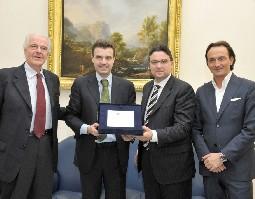 Novara - Il Novara, fresco di promozione in serie A, è stato festeggiato in Regione. Il presidente Roberto Cota ha accolto il 17 giugno nel suo ufficio il presidente onorario Carlo Accornero ed il vicepresidente esecutivo e amministratore delegato Massimo De Salvo, insieme all’assessore allo Sport, Alberto Cirio, consegnando nelle loro mani una targa di riconoscimento. “E’ davvero con grande piacere che ho dato il benvenuto ai vertici del Novara Calcio qui in Regione dopo la grande impresa che ha visto la squadra arrivare in serie A dopo una stagione fantastica - ha dichiarato Cota - Tenevo molto a questo piccolissimo momento, non solo perché sono novarese, ma soprattutto perché quello che ha fatto il Novara è la realizzazione di un sogno importante per tutto il Piemonte. Occorre complimentarsi con la società non soltanto per il risultato ottenuto, ma anche per quello che sta dietro: un grande impegno ed anche un lavoro all’insegna di determinati valori, come il grande investimento fatto per il settore giovanile. Penso che chiunque possa vedere il grande lavoro e la grande serietà nella preparazione. Spesso - ha aggiunto - si associa il calcio alla serie A e ai calciatori che sono delle celebrità: per il Novara non è così. La domenica allo stadio, ad esempio, è facile vedere tante famiglie coi bambini o ragazzini, che magari scelgono di stare in curva, per poi però tornare a casa con mamma e papà”.