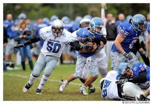 Novara - Chiamati alla seconda trasferta consecutiva i Lancieri hanno disputato domenica 13 ottobre il match contro L’Academy di Max Bertolani. Il team di Gaggiano, reduce da una brutta sconfitta a tavolino mentre erano in vantaggio di ben 12 punti, è sceso in campo determinato a portare a casa il risultato, utile se non indispensabile per la qualificazione alla seconda parte della regular season. Fin dalle prime battute i novaresi sembrano meglio organizzati e maggiormente determinati, passando quasi da subito in vantaggio con una bella segnatura del QB Nicolò Zanforlin #16 che di prepotenza segna i primi sei punti con una corsa. Trasforma senza sbavature Giuseppe ”Epo” Della Vecchia #5. I primi due quarti di partita restano a senso unico; il campo è dominato dai Blu di Novara, che non lasciano spazio all’offence meneghina con una solida difesa, e conquistano altre due volte il touch-down con precisi e passaggi su Diego “Zorro” Ricci #9 che per ben due volte lascia il segno. Ma la pausa a metà tempo permette all’esperto coach Giuso ed al motivatore Max Bertolani di rimettere ordine tra le fila e di presentare una organico per nulla domo, ma piuttosto in grado di compiere fino in fondo l’impresa. Con il terzo quarto i ragazzi dell’Academy portano a segno ogni drive offensivo, prima con 2 Td di Garetto e poi 1 Td di Bertolani su corsa centrale e riagguantano il risultato, pareggiando. Le trasformazioni di Simoni e di Genovese ribaltano il risultato a favore dei meneghini 22 a 20. Ma i Lancieri ritrovano compattezza ed orgoglio, e grazie ad una prova esemplare della difesa che non lascia in campo l’offense avversaria per più di tre tentativi, Zanforlin conquista la possibilità di riprendere il controllo del macth, con un altro Td pass sul sempre pungente “Zorro” e trasformazione da due punti di Della Vecchia. La ciliegina sulla torta la mette Roberto “Soffio” Griego #7, che da lezioni di grinta a tutti, portando lo score finale sul 22-35.