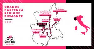 A 10 anni di distanza dall’ultima volta, e nel 160° Anniversario dell’Unità d’Italia, Torino e la Regione Piemonte ospiteranno la Grande Partenza del Giro d’Italia. La prima frazione sarà una cronometro individuale di 9 chilometri per le vie di Torino; la seconda una tappa adatta ai velocisti da Stupinigi (Nichelino) a Novara (173 chilometri) mentre la terza partirà da Biella per terminare a Canale dopo 187 km (tappa mossa adatta ai finisseur o ai colpi di mano). La Regione Piemonte sarà interessata ancora nella parte finale del Giro. Infatti la 19^ tappa vedrà l’arrivo in salita sull’Alpe di Mera in Valsesia e il giorno seguente la partenza da Verbania.