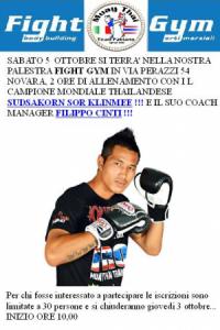 Novara - Direttamente dalla Thailandia sabato 5 ottobre alle ore 10 il pluricampione mondiale thailandese di Muay Thai, Sudsakorn Sor Klinmee, terrà uno stage nella palestra “Fight Gym” di via Perazzi 54 a Novara, accompagnato dal suo coach manager Filippo Cinti che vive in Thailandia. Oltre a tenere lo stage al pubblico il campione mondiale si allenerà con il maestro Christian Fabiano e il maestro Filippo Piantanida della Muay Thai Team Fabiano, visto che a breve il fighter difenderà il titolo Mondiale a Parigi. L'appuntamento è organizzato dall'A.S.D. Muay Thai Team Fabiano Novara.