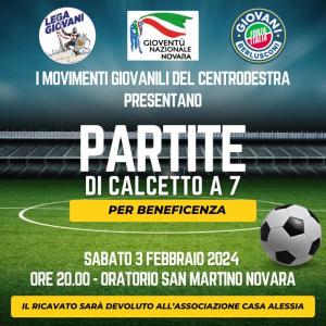 Novara - Sabato 3 febbraio dalle ore 20 si terrà presso l’oratorio di San Martino a Novara il triangolare delle giovanili di centro destra come da locandina allegata. Il ricavato sarà devoluto in beneficenza all’associazione Casa Alessia. Per le ore 21.15 si terrà la premiazione alla presenza di esponenti dei tre partiti e dei rappresentanti dell’associazione.