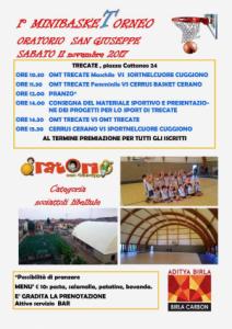 Trecate - Si parte sabato 11 novembre con il primo degli appuntamenti in programma per il prossimo fine settimana: l’Oratorio San Giuseppe ospiterà infatti a partire dalle ore 10.30 il 1° MinibaskeTorneo, che coinvolgerà le formazioni del minibasket di Trecate (OMT), Creano (Cerrus Basket) e Cuggiono (Sportnelcuore). Un ringraziamento particolare ad Adytia Birla Carbon per il proprio contributo. Per chi lo desidera è possibile fermarsi a pranzo (menù con pasta, salamella, patatine e bevanda a 10 euro – informazioni e prenotazioni presso il bar dell’Oratorio).