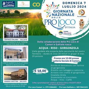 Galliate - Domenica 7 luglio si celebra la Giornata Nazione delle Pro Loco di Italia e per l’occasione, dalla collaborazione delle Pro Loco di Cameri e di Galliate, nasce: Acqua - Riso - Gorgonzola. Visite guidate e gratuite della durata di 20 minuti in gruppi da 20 persone, alla scoperta delle peculiarità del nostro Territorio... dove? Dalle 9 alle 11 appuntamento alle turbine presso la Centrale Orlandi di Galliate; dalle 11 alle 13 alla Latteria Sociale di Cameri, alla scoperta del gorgonzola come una volta; dalle 15.30 alle 17 al mulino della Riseria Capittini di Galliate; pranzo alle ore 13 presso il giardino della Latteria Sociale di Cameri, menù fisso € 18 compreso acqua, vino e caffè.