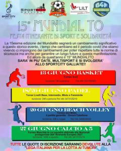 Galliate - Manifestazione sportiva benefica a favore di Lilt Novara, il Mundialito, giunta alla 15a edizione. L’evento non si è tenuto lo scorso anno a causa della pandemia: torna nel 2021 con tante novità. La prima è la nuova location, lo Sport City di Galliate. Ciò consente di aggiungere ai tradizionali tornei di calcio a 5 e beach volley, quelli di padel e basket. La manifestazione inoltre si svolgerà in più date per non creare assembramenti e rispettare tutte le regole anti Covid. Tutto il ricavato delle iscrizioni sarà ancora una volta devoluto a Lilt Novara. L’organizzazione è a cura di Lega 5 Novara Asd, B4F Beach for Fun Novara Asd, Sport City Galliate e Padel Sport City Galliate con il contributo di Gallé Sas. Si ringraziano i promotori dell’iniziativa per continuare a essere al fianco della sezione novarese della Lega italiana per la lotta contro i tumori nel sostegno ai malati oncologici e alle loro famiglie.
