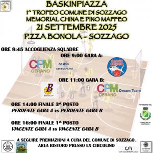 Sozzago - La nuova stagione prende il via con un torneo! "Domenica 21 settembre - spiegano gli organizzatori - avremo il piacere di ospitare Oleggio Baskin e asd Baskin Ciuff aps sul nostro nuovo terreno di gioco! Sarà una bella sfida, in preparazione al campionato. Grazie al Comune di Sozzago che ci sostiene in questo evento". Il 1° Trofeo Comune di Sozzago - Memorial China e Pino Maffeo si tiene nella centralissima piazza Bonola. Alle ore 8.45 si comincia con la gara A Cpm Cerano baslin Cerrus-Baskin Oleggio; alle ore 11 l'altra sfida tra Baskin Ciuff e Cpm Cerano Dream Team. Nel pomeriggio alle 14 la finale per il 3°/4° posto tra le due perdenti e alle 16 la finalissima che decreterà la squadra vincitrice. A seguire ci saranno le premiazioni a cura del Comune di Sozzago nell'ex Circolino.