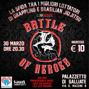 Galliate - Botte da orbi e serata di grandi emozioni al Palazzetto di Galliate in via Mazzini 8 per ‘Battle of Heroes’. In programma sabato 30 marzo a partire dalle 20.30 sfide tra i migliori lottatori di grappling e brasilian ju jitsu. Padrone di casa il team diretto da Luca Cardano. Ingresso: 10 euro. Info: 338 6935313 - 333 7926686.