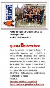 Trecate - Domenica 28 giugno alle ore 20 presso la pizzeria “La vecchia Posta” in Piazza Cattaneo n. 33 si terrà una cena per festeggiare la straordinaria promozione in serie B del Basket Club Trecate. Sarà certamente una bella occasione per incontrare la dirigenza, l’allenatore e una delegazione dei giocatori, ma soprattutto per sostenere concretamente la società e per aiutarla a partecipare ad un campionato tanto importante quanto prestigioso e purtroppo costoso. Con soli 15 Euro per gli adulti (pizza, bevanda, caffè e digestivo), 10 Euro per gli under 15 (pizza, bevanda e gelato) e una raccolta fondi tutti insieme metteremo la dirigenza del BC Trecate in grado di accettare un’altra grande sfida sportiva. Per info e adesioni: Filippo Sansottera: 333 7108466; Giovanni Varone: 393 3831543.